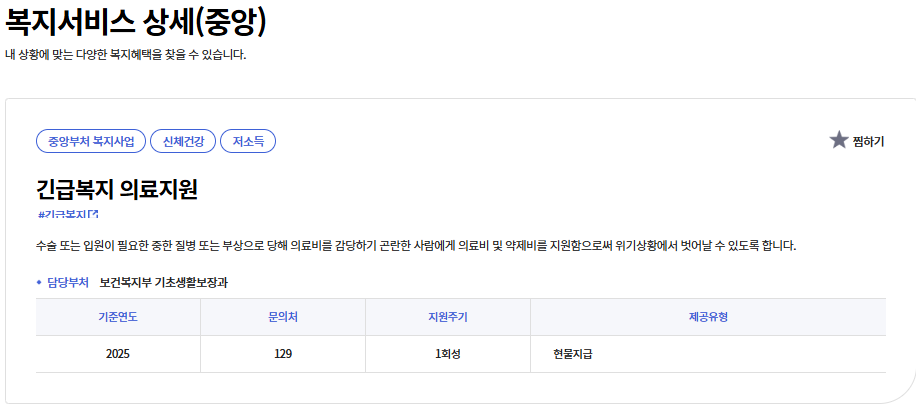 긴급복지 의료지원에 대한 자세한 사항은 보건복지부 상담센터(129)로 문의하면 됩니다.