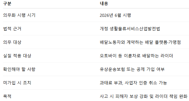 법적 의무 주체는 사업자이지만, 사실상 배달노동자의 보험 가입이 필수 조건이 된 셈입니다.