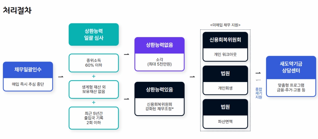 일반적인 개인회생이나 신용회복 절차보다 훨씬 간소화되어, 별도의 신청 절차 없이 금융기관에서 자동으로 채권을 넘기면 심사가 이뤄지는 구조입니다.