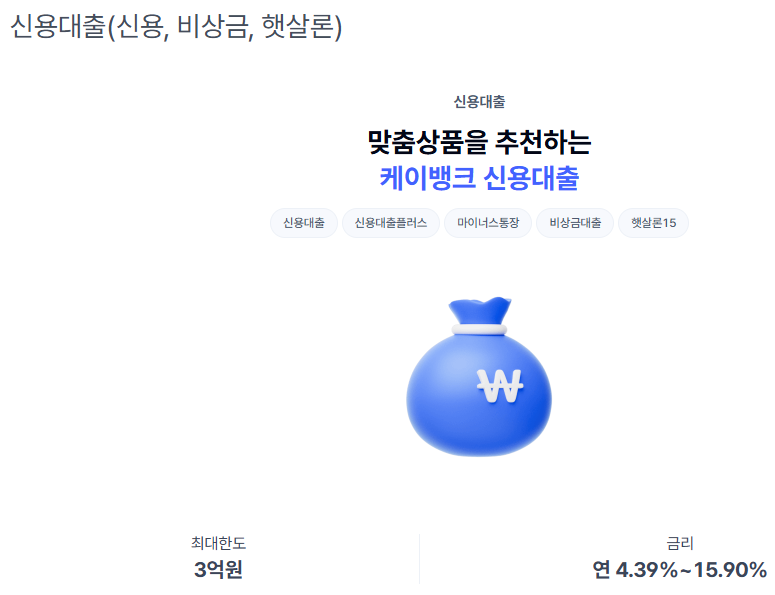 케이뱅크 비상금대출 금리는 연 4.39%~15.90% 수준으로 개인의 신용상태에 따라 달라집니다.