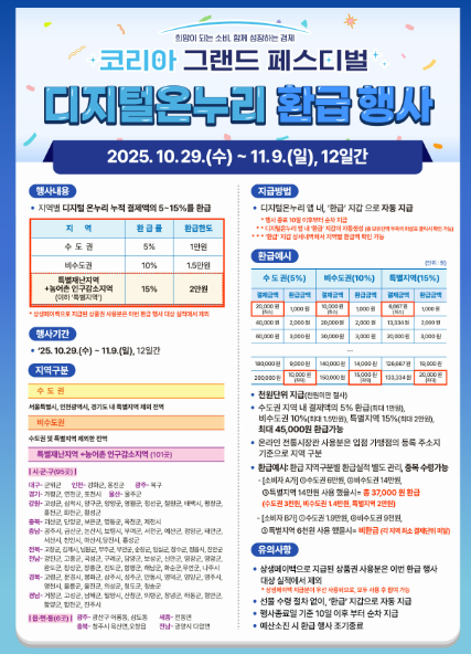 올해는 ‘코리아 그랜드 페스티벌’과 연계되어 전국 단위로 확대 시행되며, 수도권, 비수도권, 특별지역으로 구분해 차등 환급률을 적용합니다.