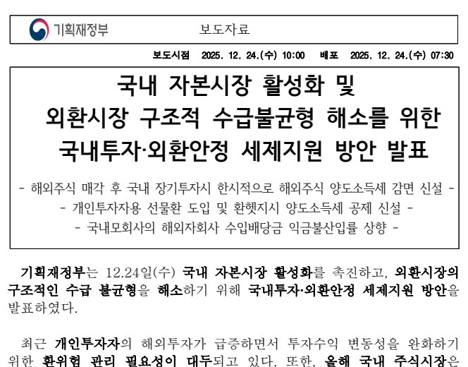 해외주식 투자로 수익을 냈지만 세금 부담 때문에 국내 주식시장으로 다시 돌아오는 것을 망설이는 투자자들이 많았습니다. 이런 흐름을 바꾸기 위해 정부가 2026년을 목표로 국내 자본시장 복귀를 유도하는 세제 개편을 추진하고 있습니다. 국장 복귀 시 해외주식 양도세를 줄여주고, 장기투자자에게는 배당소득 분리과세와 소득공제까지 제공하는 구조가 핵심입니다. 이번 제도는 단순한 감면이 아니라 투자 방향 자체를 바꾸는 유인책이라는 점에서 주목할 … 더 읽기